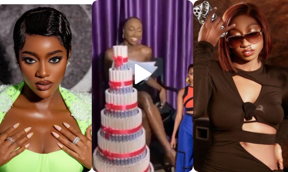 The freshly ousted housemate is seen sitting in a chair and applying her cosmetics in the video released on Doyin’s fan page when this enormous money cake is brought in.