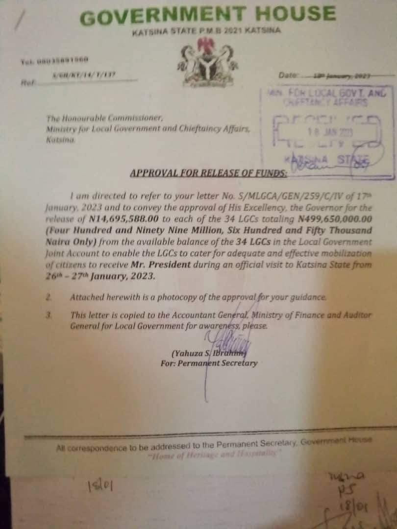 “From the available balance of the 34 LGCs in the Local Government Joint Account to enable the LGCs to cater for adequate and effective mobilization of citizens to receive Mr. President during an official visit to Katsina State from 26th -27th January, 2023.