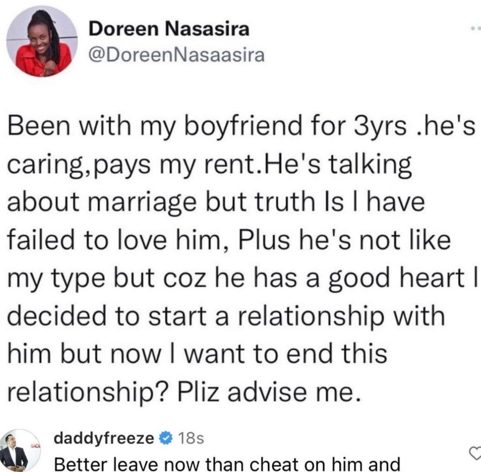 Media personality, Daddy Freeze advised her to leave the man now rather than marry him and end up cheating on him.