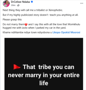 On Tuesday, July 29, Dr. Ndaba shared a post highlighting her stance on intertribal marriages, stating:
