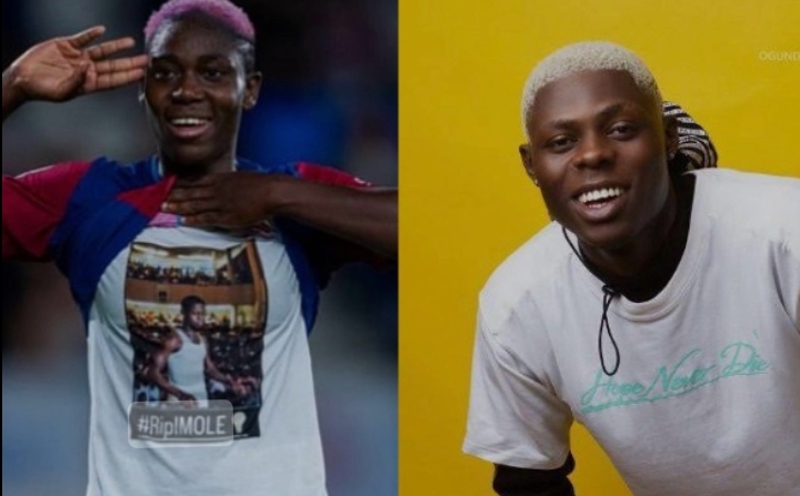 After aiding FC Barcelona’s women’s team in their 6-1 victory over Granada, Asisat Oshoala shared a photo on her Instagram page, showing her tribute to Mohbad during her goal celebration. In the photo’s caption, the five-time African Woman Player of the Year wrote: “Double for Imole ⚽️⚽️…..keep resting young king 🙏🏾❤️ #LightBoy.”