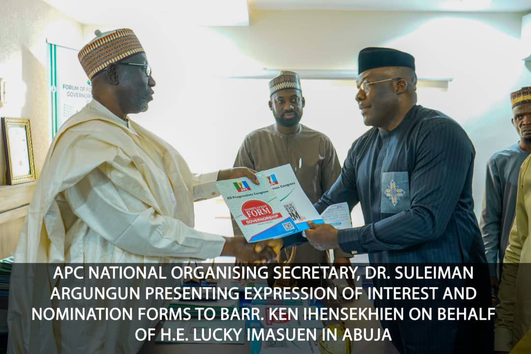The National Organising Secretary of the APC, H.E Dr. Suleiman Muhammad Argungun OFR, played a pivotal role in the symbolic handover of the forms to Hon. Ihensekhien on behalf of the aspirant, Lucky Imasuen.