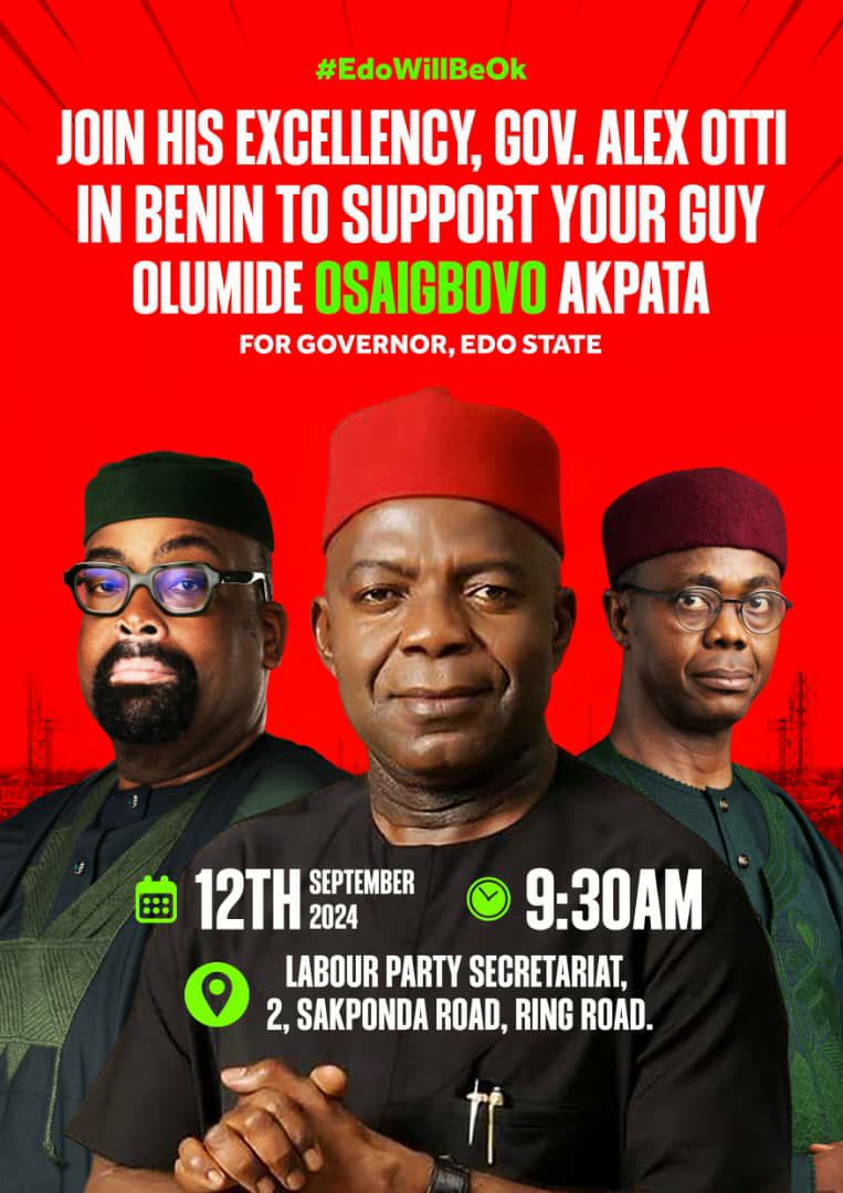 Tomorrow, September 12th, 2024, one of the most highly regarded governors in the country, Alex Otti of the Labour Party, will arrive in the historic city of Benin to lend his support to Olumide Osaigbovo Akpata, the Labour Party’s gubernatorial candidate. With the Edo election just ten days away, Otti’s arrival is set to boost the momentum of the campaign, signaling the Labour Party’s growing influence in Edo State.