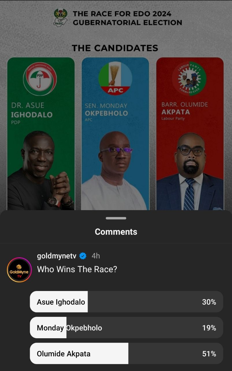 With just hours remaining before the highly anticipated Edo gubernatorial election, which will ultimately decide the fate of all candidates, political stakeholders, and, most importantly, the structure (Edolites) and future of Edo State, Labour Party’s Olumide Osaigbovo Akpata has surged ahead. At the time of writing, Akpata is leading a pivotal online poll with over 51% of the votes, leaving his rivals far behind—right where they belong.
