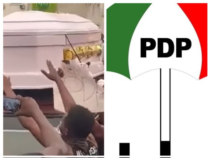 A lady was spotted kneeling appreciating God for Otti’s victory while others were pulling their clothes but the one causing a huge stir online is a video of able-bodied men carrying a coffin indicating PDP inside and buried in the state.