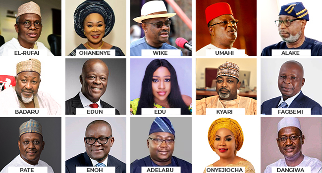 Among the 45 confirmed ministers are: Abubakar Kyari (Borno), Nyesom Wike (Rivers), Joseph Utsev (Benue), John Owan Enoh (Cross River), Bello Mohammad (Sokoto), Mohammed Badaru Abubakar (Jigawa), Yusuf Maitama Tuggar (Bauchi), Uju Kennedy Ohaneye (Anambra), Olubunmi Tunji-Ojo (Ondo), Nkieruka Onyejeocha (Abia), Betta Edu (Cross River), Imaan Sulieman Ibrahim (Nasarawa), David Umahi (Ebonyi), Adebayo Olawale Edun (Ogun), Ahmed Musa Dangiwa (Katsina), Uche Geoffrey Nnaji (Enugu), Dele Alake (Ekiti), Waheed Adebayo Adelabu (Oyo), Mohammed Idris (Niger), Ali Pate (Bauchi), Doris Anite Uzoka (Imo), Lateef Fabemi SAN (Kwara), Ekperikpe Ekpo (Akwa Ibom), Hannatu Musawa (Katsina), Ibrahim Geidam (Yobe), Aliyu Sabi Abdullahi (Niger), Hieneken Lokpobiri (Bayelsa), Alkali Ahmed Saidu (Gombe), Tanko Sununu (Kebbi), Atiku Bagudu (Kebbi), Bello Matawalle (Zamfara), Adegboyega Oyetola (Osun), Simon Bako Lalong (Plateau), Abdullahi Tijani Muhammad Gwarzo (Kano), Bosun Tijani (Ogun), Mariya Mahmoud Bunkure (Kano), Iziaq Salako (Ogun), Tunji Alausa (Lagos), Lola Ade-John (Lagos), Tahir Mamman SAN (Adamawa), Zephaniah Jisalo (FCT), Uba Maigari Ahmadu (Taraba), Shuaibu Abubakar Audu (Kogi), and Festus Keyamo SAN (Delta).