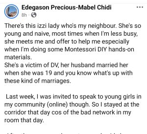 According to her, the neighbour got married young—at just 19—and had long endured physical abuse from her husband. However, things began to change after the neighbour overheard her teaching an online course aimed at empowering young girls.