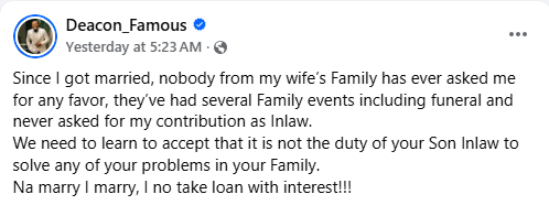 A Nigerian man, Deacon Famous, has stated that it is not the responsibility of a son-in-law to cater to or solve issues in his wife’s family.....KINDLY READ THE FULL STORY HERE▶