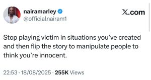 He wrote: “Stop playing victim in situations you’ve created and then flip the story to manipulate people into thinking you’re innocent.”