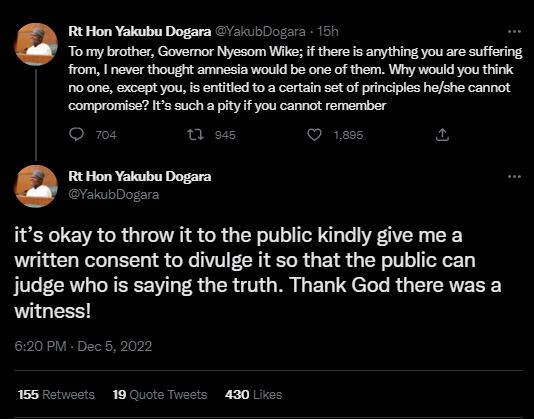 A former Speaker of the House of Representatives, Yakubu Dogara has replied to the governor of Rivers State, Nyesom Wike.